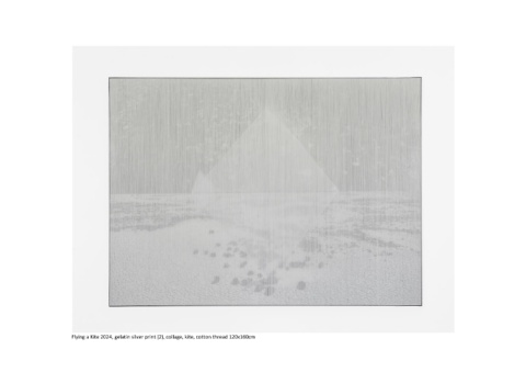 Flying a Kite 2024, gelatin silver print (2), collage, kite, cotton thread 120x160cm