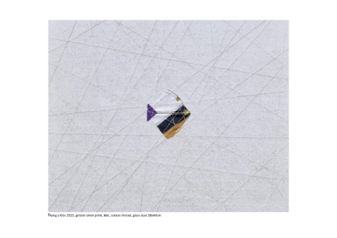 Flying a Kite 2025, gelatin silver print, kite, cotton thread, glass dust 38x44cm